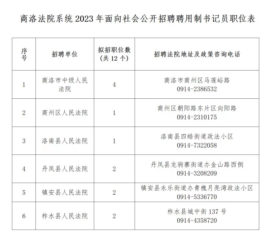 全市法院共招聘聘用制書記員12名,各法院招聘職位、地址及政策咨詢電話詳見《商洛法院系統(tǒng)2023年面向社會公開招聘聘用制書記員職位表》(附件)。